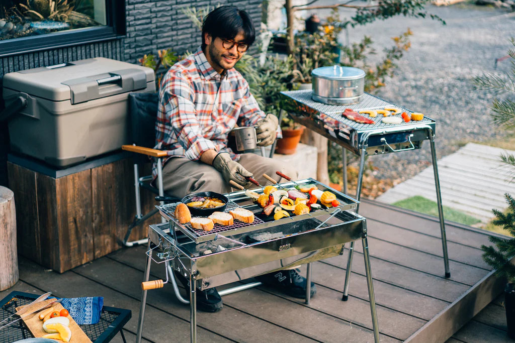 フレーム部分に串置きがあるので網焼き調理と串焼き調理が同時に楽しめます