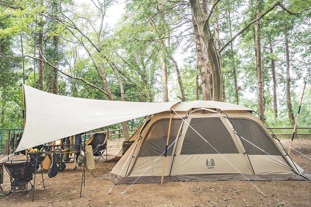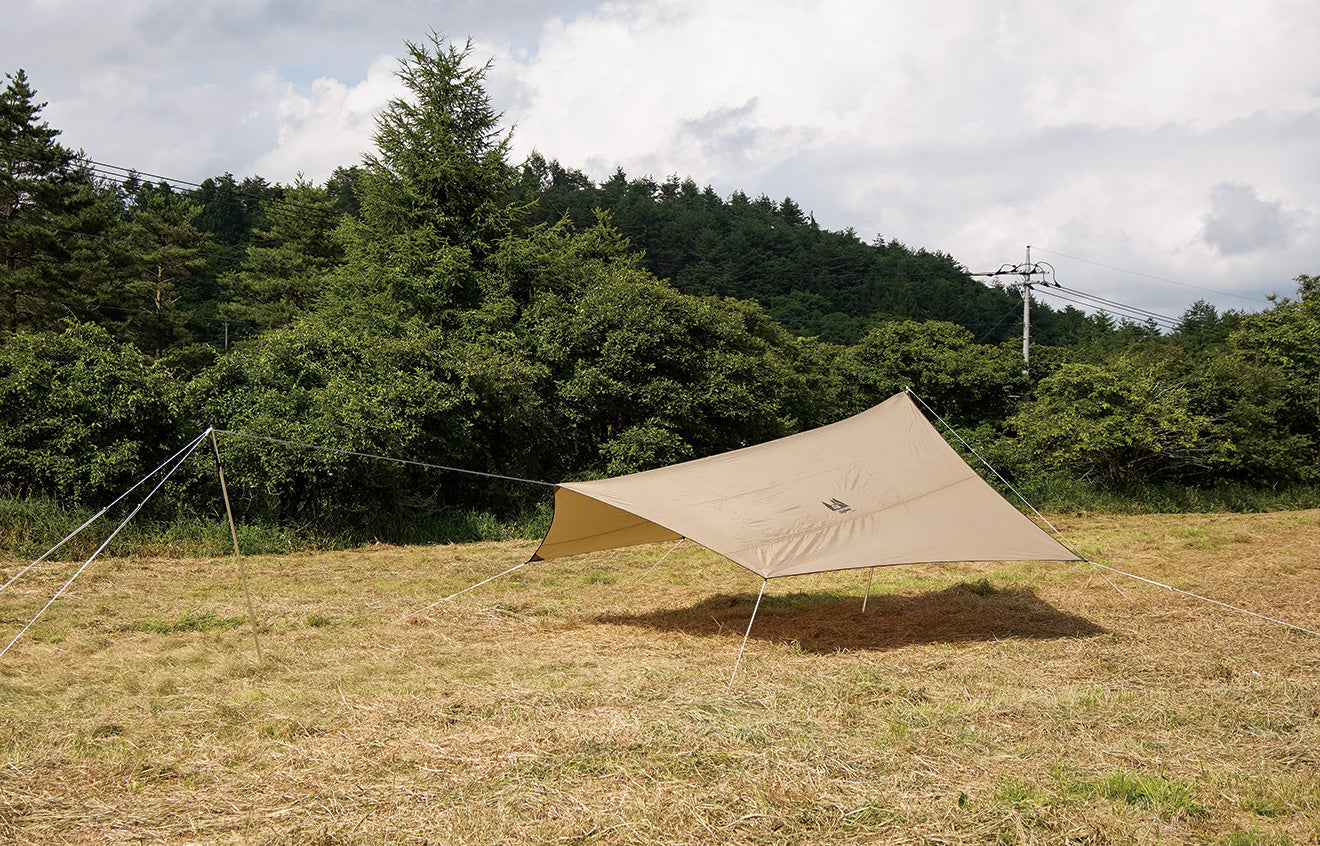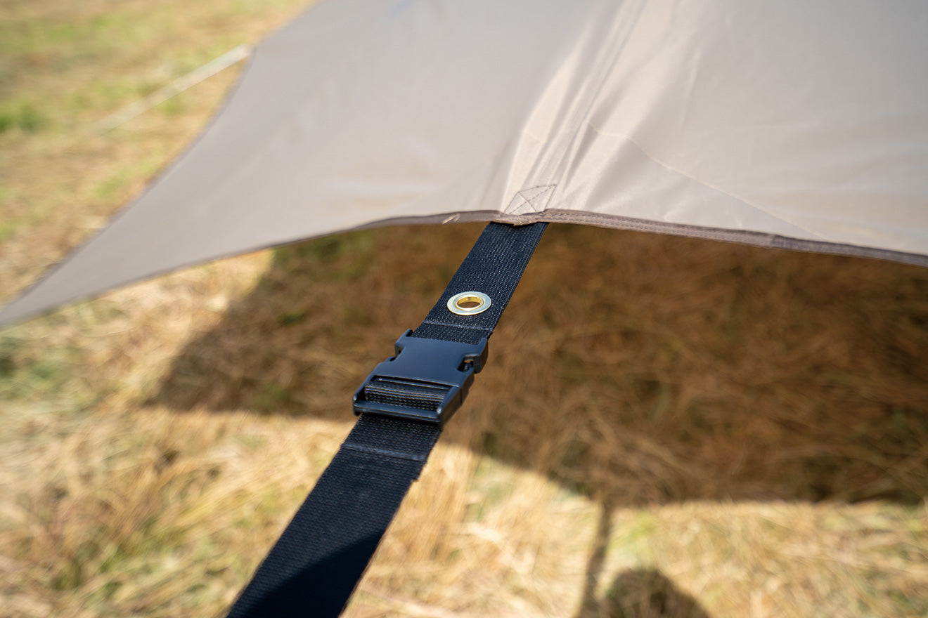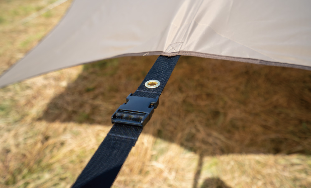 テントとの連結を簡単にセッティングできるテープつきのシステムタープ。