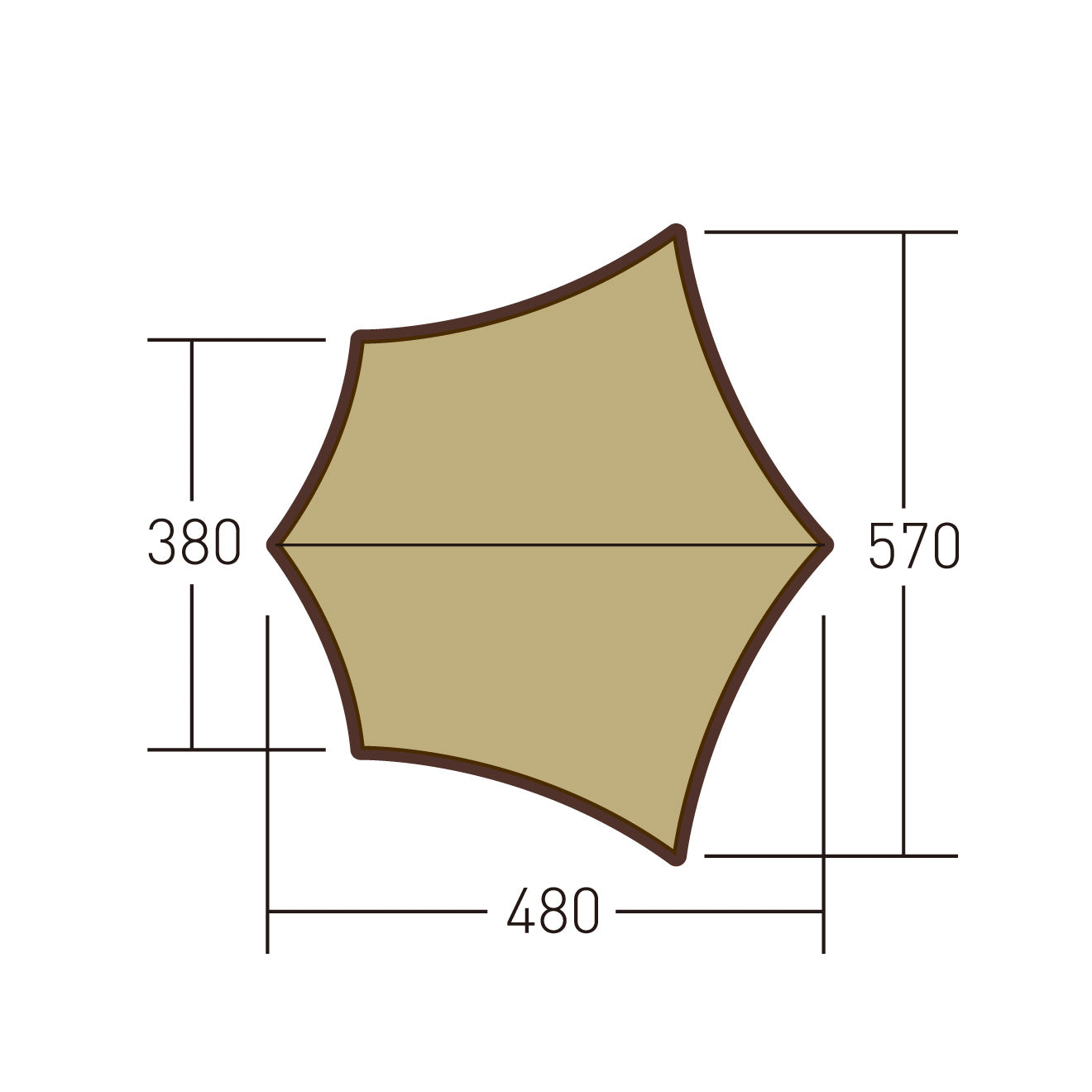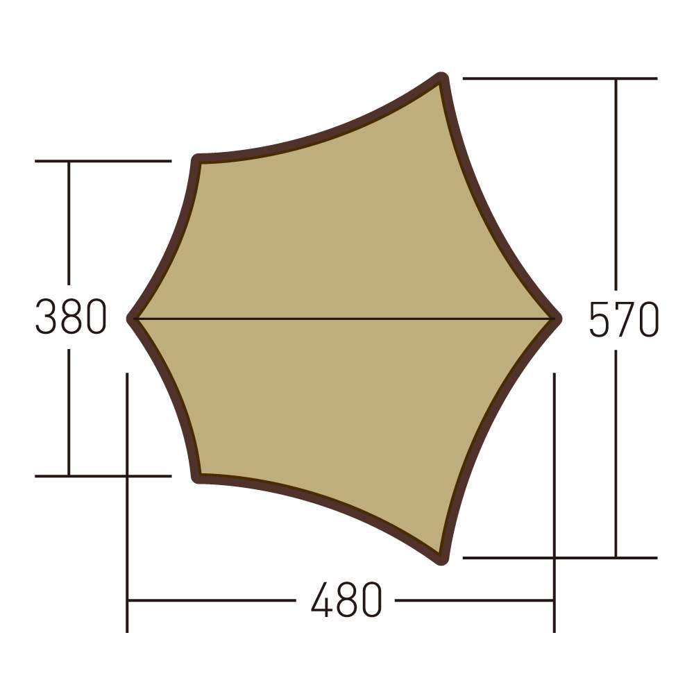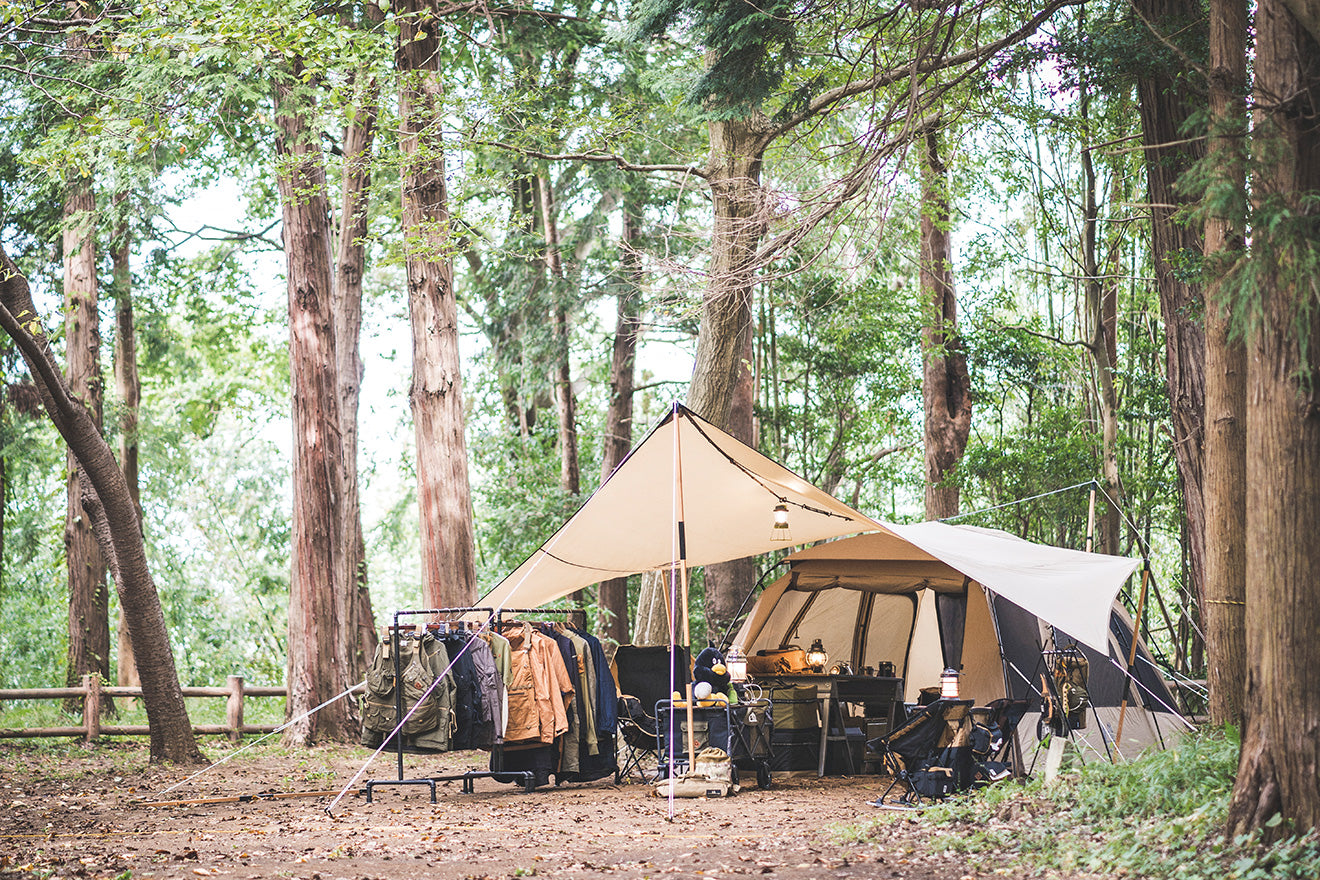 テントとの連結を簡単にセッティングできるテープつきのシステムタープ。